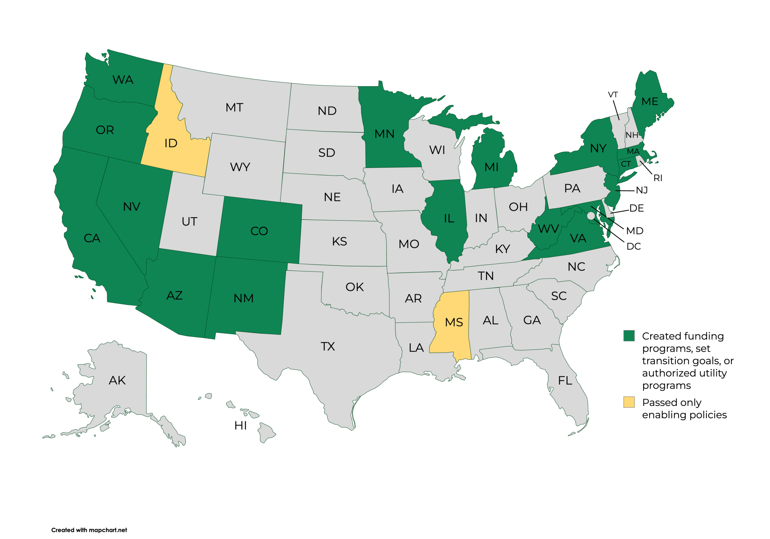 Algunos estados han actuado con visión y ambición. California ha invertido más de 1.390 millones de dólares en autobuses escolares eléctricos desde principios de la década de 2010; el estado también tiene un objetivo de transición a nivel estatal y ha ordenado a las empresas de servicios públicos que apoyen la electrificación de los vehículos. Connecticut, Maryland, New York y Washington También se han aprobado leyes estatales, se han establecido objetivos de transición a nivel estatal y se han creado programas de financiación para autobuses escolares eléctricos.