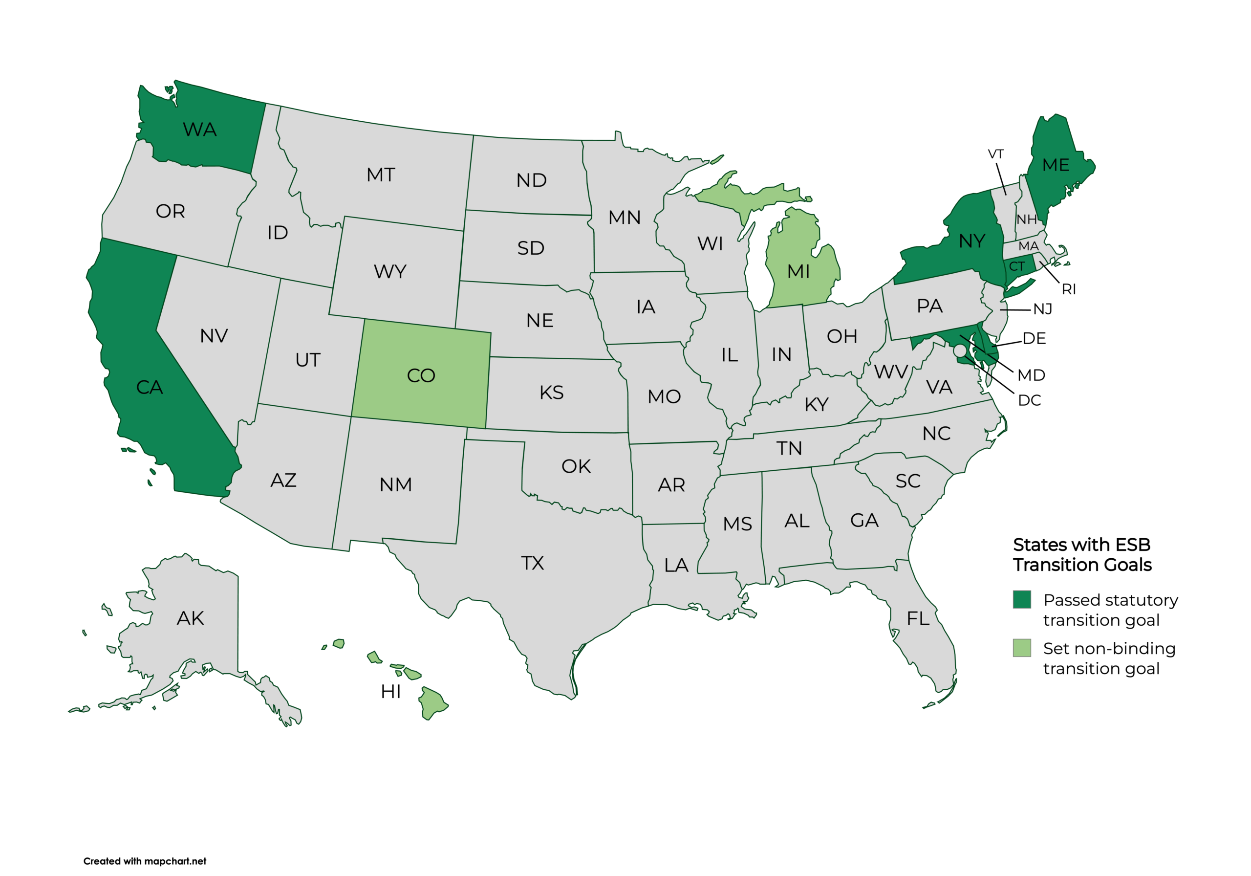 Para 2025, al menos seis estados han establecido un año objetivo específico, mientras que Washington inicia su transición cuando los autobuses escolares eléctricos alcancen el mismo Costo Total de Propiedad que los autobuses diésel. Algunos estados aspiran a realizar la transición del 100 % de sus flotas, mientras que otros solo una parte. Al menos tres estados (Colorado, Michigan y Hawái) han establecido objetivos de transición no vinculantes. Los requisitos de transición pueden aplicarse a las nuevas compras y contratos de autobuses escolares, a todos los autobuses escolares que operan en un estado, o a ambos.